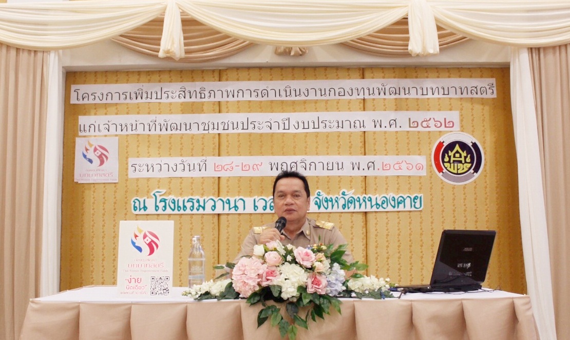 (*)ดร.วทัญญู แสนใจวุฒิ พัฒนาการจังหวัดหนองคาย ได้มอบแนวทางการดำเนินงานกองทุนพัฒนาบทบาทสตรี แก่เจ้าหน้าที่พัฒนาชุมชน โดยมี น.ส.บุศราวรรณ เรืองช่อ หัวหน้ากลุ่มงานสารสนเทศการพัฒนาชุมชน เป็นผู้บริหารรับผิดชอบโครงการ ดำเนินการระหว่างวันที่ 28-29 พฤศจิกายน 2561 ณ โรงแรมวานาเวลเนส รีสอร์ทหนองคาย อ.เมืองหนองคาย จ.หนองคาย กลุ่มเป้าหมาย พัฒนาการอำเภอ เจ้าหน้าที่พัฒนาชุมชนทุกคน อสพ. และพนักงานกองทุนพัฒนาบทบาทสตรี เข้าร่วมโครงการฯ จำนวน ๔๐ คน