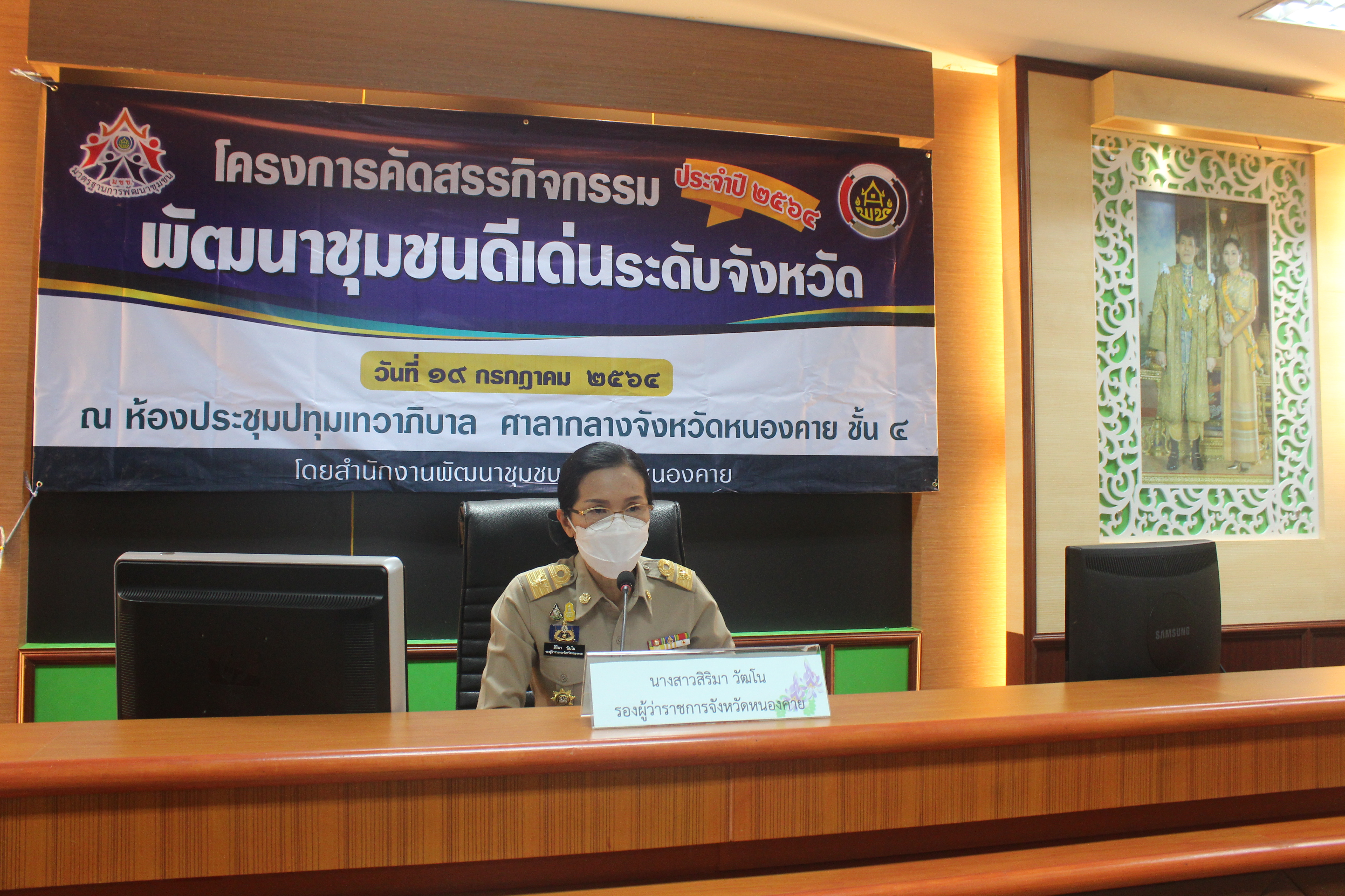 ?? วันที่ 19 กรกฎาคม 2564 เวลา 10.00 น. นายประเสริฐ ลือชาธนานนท์ ผู้ว่าราชการจังหวัดหนองคาย มอบหมายให้ นางสาวสิริมา วัฒโน รองผู้ว่าราชการจังหวัดหนองคาย เป็นประธานการดำเนินโครงการคัดสรรกิจกรรมพัฒนาชุมชนดีเด่นประจำปี ๒๕๖๔ พร้อมด้วย นายไพโรจน์ โสภาพร พัฒนาการจังหวัดหนองคาย นางสาวบุศราวรรณ เรืองช่อ ผู้อำนวยการกลุ่มงานส่งเสริมการพัฒนาชุมชน และ คณะกรรมการคัดสรรกิจกรรมพัฒนาชุมชนดีเด่นจังหวัดหนองคาย ประจำปี 2564 ร่วมกิจกรรมดังกล่าว ณ ห้องประชุมปทุมเทวาภิบาล ศาลากลางจังหวัดหนองคาย ชั้น ๔