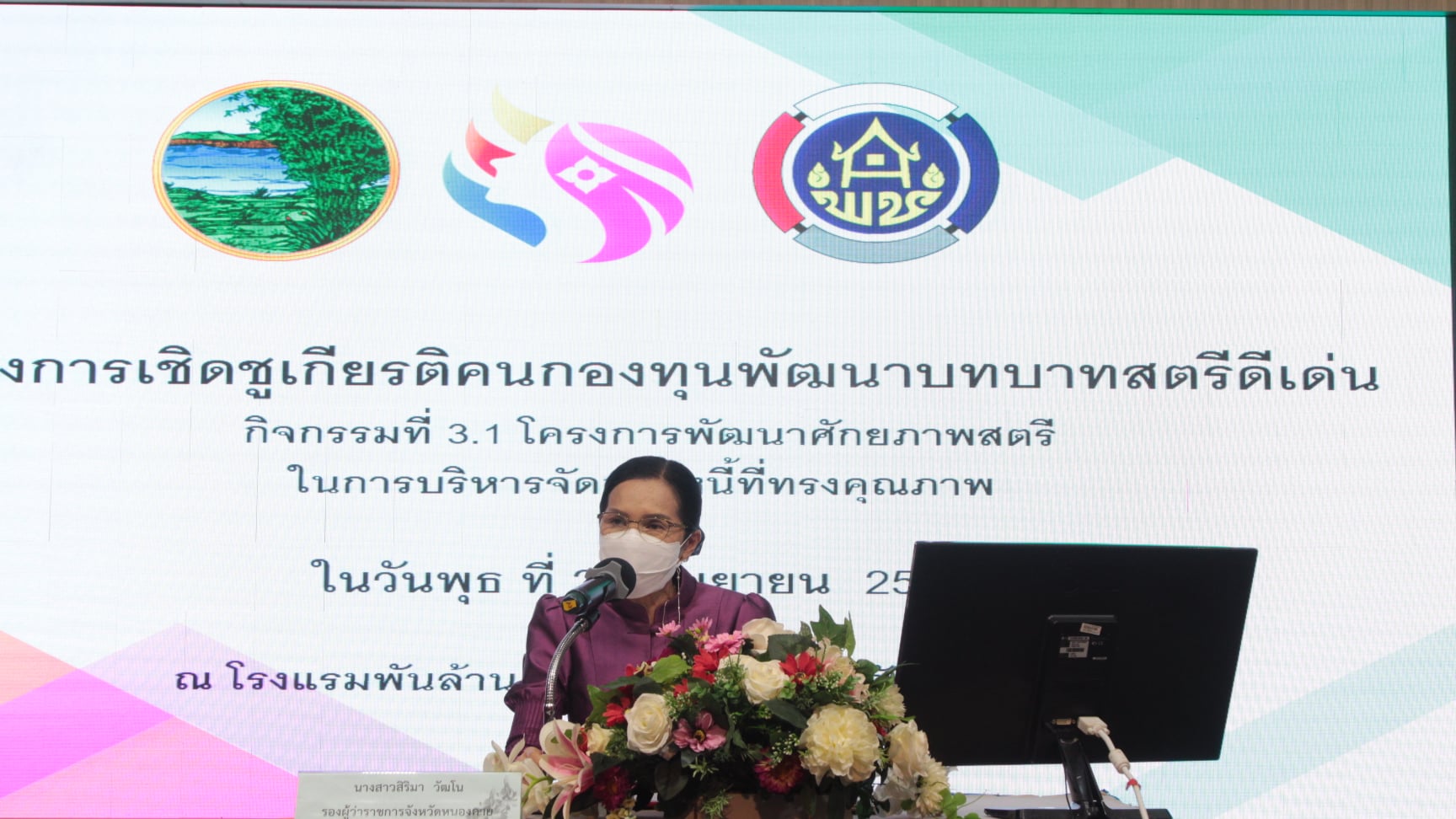 ?? วันที่ 29 กันยายน 2564 เวลา 10.00 น. นายประเสริฐ ลือชาธนานนท์ ผู้ว่าราชการจังหวัดหนองคาย มอบหมายให้ นางสาวสิริมา วัฒโน รองผู้ว่าราชการจังหวัดหนองคาย เป็นประธานเปิดโครงการเชิดชูเกียรติกองทุนพัฒนาบทบาทสตรี ดีเด่น ประจำปี 2564 กิจกรรมที่ 3 คัดเลือกคณะทำงานขับเคลื่อนกองทุนพัฒนาบทบาทสตรีจังหวัดที่มีการบริหารจัดการหนี้เกินกำหนดชำระดีเด่น ประจำปี 2564 กิจกรรมที่ 3.1 โครงการพัฒนาศักยภาพสตรีในการบริหารจัดการหนี้ทรงคุณภาพ พร้อมด้วย นายไพโรจน์ โสภาพร พัฒนาการจังหวัดหนองคาย นายสามิตร์ เครือคำ ผู้อำนวยการกลุ่มงานสารสนเทศการพัฒนาชุมชน หัวหน้าส่วนราชการ นักวิชาการพัฒนาชุมชน กลุ่มงานสารสนเทศ และคณะกรรมการพัฒนาสตรีจังหวัดหนองคาย โดยประธานได้มอบมอบทะเบียนลูกหนี้แก่คณะทำงานขับเคลื่อนกองทุนพัฒนาบทบาทสตรีทั้ง 9 อำเภอ
