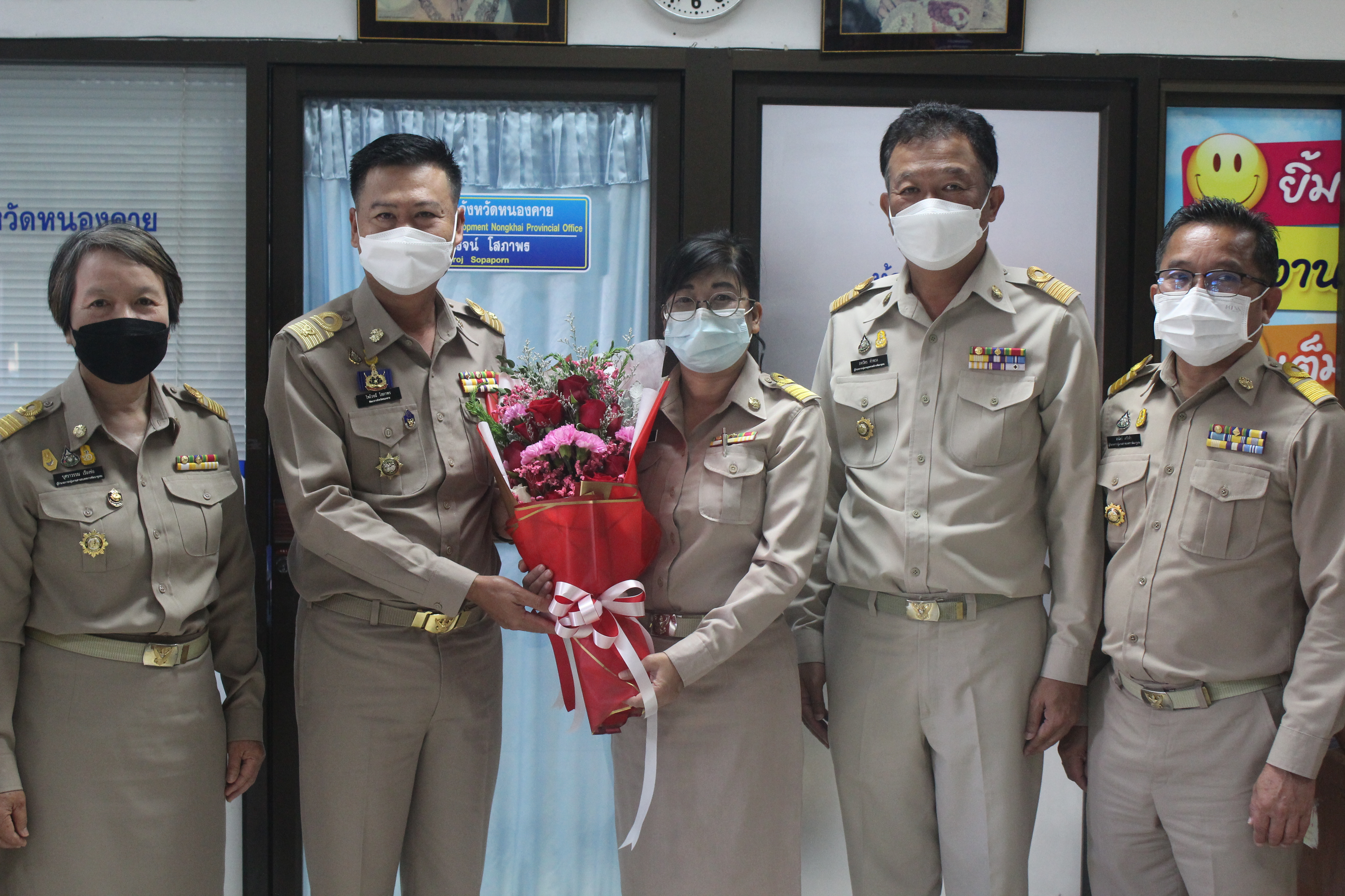 ? ? วันที่ 25 ตุลาคม 2564 เวลา 09.45 น. นายไพโรจน์ โสภาพร พัฒนาการจังหวัดหนองคาย พร้อมด้วยผู้อำนวยการกลุ่มงานฯ มอบดอกไม้แสดงความยินดีและต้อนรับ นางจรุงรักษ์ ยอดสิงห์ ข้าราชการที่ได้รับการแต่งตั้ง ให้รักษาการในตำแหน่ง ผู้อำนวยการกลุ่มงานประสานและสนับสนุนการบริหารงานพัฒนาชุมชน(นักวิชาการพัฒนาชุมชนชำนาญการพิเศษ) สำนักงานพัฒนาชุมชนจังหวัดหนองคาย ตามคำสั่งกรมการพัฒนาชุมชน ที่ 1471/2564 ลงวันที่ 12 ตุลาคม พ.ศ. 2564 ให้ข้าราชการดังกล่าว มารายงานตัวเพื่อปฏิบัติงาน ณ สำนักงานพัฒนาชุมชนจังหวัดหนองคาย ตั้งแต่วันที่ 25 ตุลาคม 2564 เป็นต้นไป