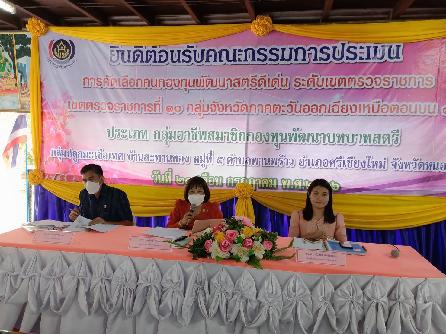 นางนวลจันทร์ ศรีมงคล ผู้ตรวจราชการกรมการพัฒนาชุมชน เขตตรวจราชการที่ 10 ประธานคณะกรรมการคัดเลือกคนกองทุนพัฒนาบทบาทสตรีดีเด่นระดับเขตตรวจราชการ พร้อมด้วยคณะกรรมการฯ ลงพื้นที่เข้าตรวจประเมินคัดเลือกคนกองทุนพัฒนาบทบาทสตรีดีเด่น ระดับเขตตรวจราชการที่ 10 จังหวัดหนองคาย วันที่ 2