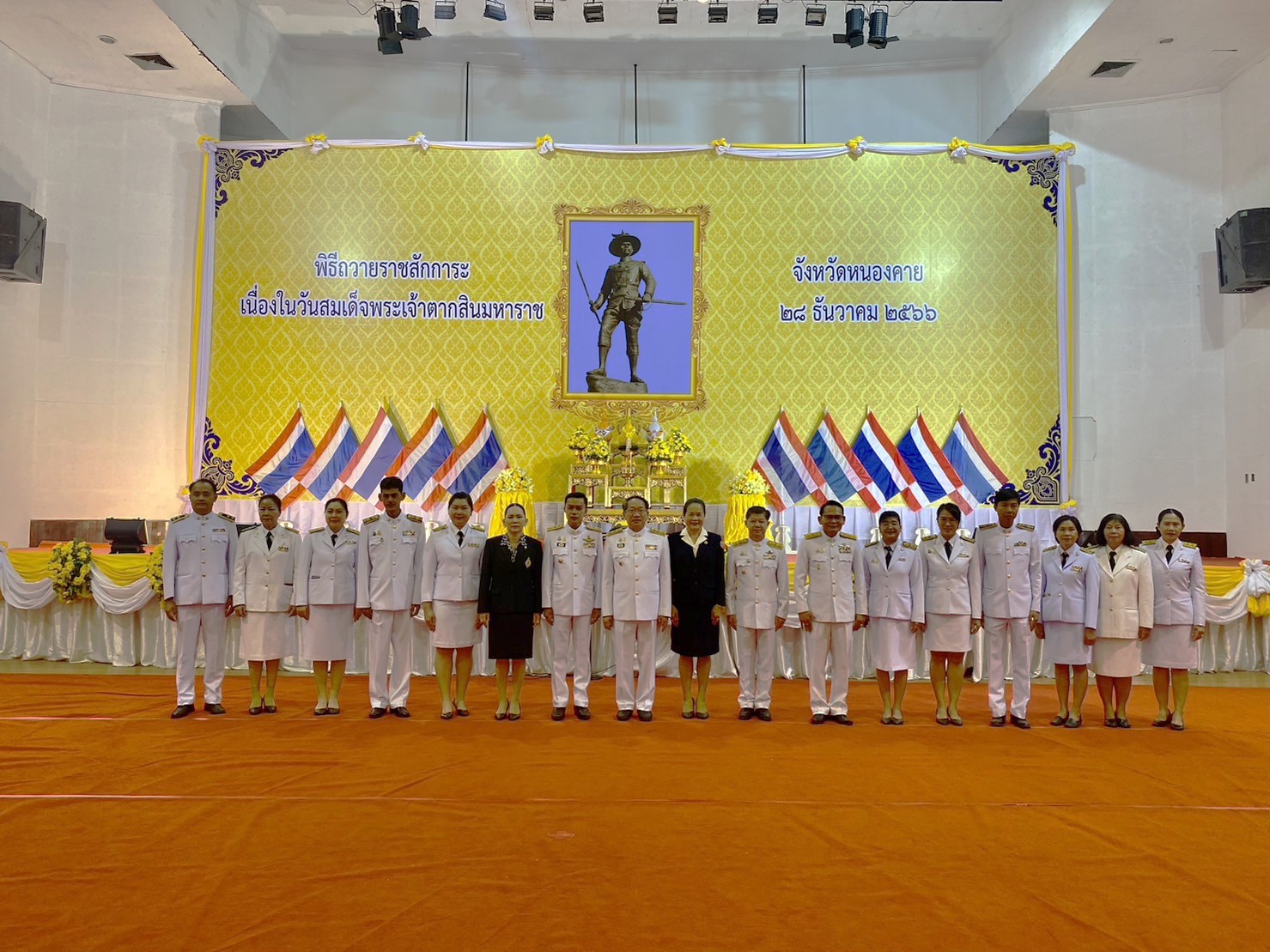 ในการนี้นายประดิษฐ์ นัดทะยาย พัฒนาการจังหวัดหนองคาย พร้อมด้วยนางจรุงรักษ์ ยอดสิงห์ ผู้อำนวยการกลุ่มงานประสานและสนับสนุนการบริหารงานพัฒนาชุมชน และบุคลากรในสังกัด เข้าร่วมพิธีดังกล่าว เพื่อน้อมรำลึกในพระมหากรุณาธิคุณของสมเด็จพระเจ้าตากสินมหาราช ที่ทรงกอบกู้เอกราชบ้านเมืองกลับคืนมา ภายหลังจากที่แผ่นดินกรุงศรีอยุธยาถูกข้าศึกบุกยึดทำลายเสียหาย