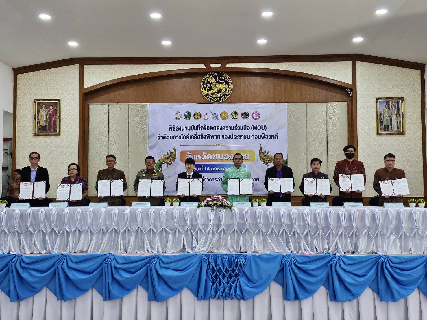 พช.หนองคาย ร่วมลงนาม MOU ว่าด้วยการไกล่เกลี่ยข้อพิพาทของประชาชนก่อนฟ้องคดี และกิจกรรม “ตลาดนัดแก้หนี้” จังหวัดหนองคาย
