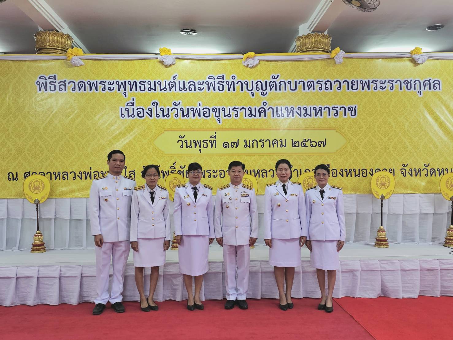 วันที่ 17 มกราคม 2567 เวลา 06.30 น. จังหวัดหนองคาย จัดพิธีสวดพระพุทธมนต์และพิธีทำบุญตักบาตรถวายพระราชกุศล เนื่องในวันพ่อขุนรามคำแหงมหาราช ประจำปีพุทธศักราช 2567 โดยมีนายราชันย์ ซุ้นหั้ว ผู้ว่าราชการจังหวัดหนองคาย เป็นประธานฝ่ายฆราวาส และมีพระศรีวชิรโมลี รองเจ้าคณะจังหวัดหนองคาย / เจ้าอาวาสวัดชัยพร เป็นประธานฝ่ายสงฆ์ พร้อมนำพระสงฆ์และสามเณร จำนวน 49 รูปออกรับบิณฑบาต ซึ่งมีหัวหน้าส่วนราชการ หน่วยงานทั้งภาครัฐและเอกชน พสกนิกรในจังหวัดหนองคายทุกหมู่เหล่า เข้าร่วมพิธีอย่างพร้อมเพรียง