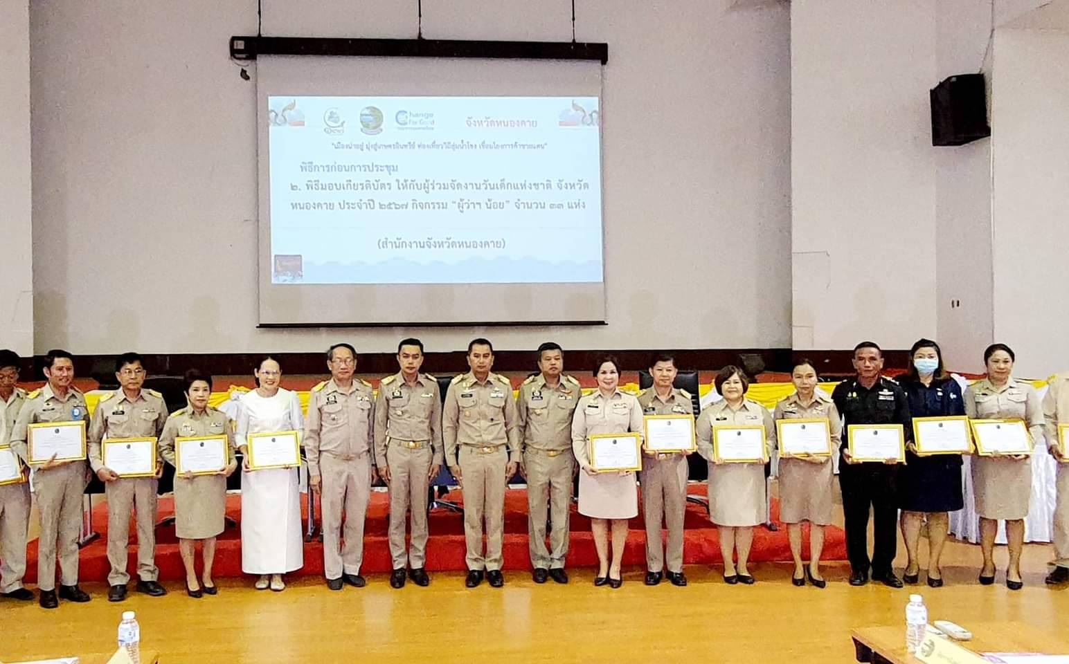 ก่อนการประชุมได้มีพิธีมอบเกียรติบัตรประกาศยกย่องชุมชน องค์กร และอำเภอคุณธรรม ระดับคุณธรรมต้นแบบตามโครงการส่งเสริมชุมชน องค์กร อำเภอ และจังหวัดคุณธรรม จำนวน 41 ราย และเกียรติบัตรการสนับสนุนในการจัดงานวันเด็กแห่งชาติ จังหวัดหนองคาย ประจำปี 2567 โดยนายประดิษฐ์ นัดทะยาย พัฒนาการจังหวัดหนองคาย ได้เข้ารับเกียรติบัตรฯ ทั้งสองกิจกรรม และร่วมประชุมเพื่อรับทราบนโยบายสำคัญของรัฐบาลที่สั่งการ และนำเสนอความก้าวหน้าของการปฏิบัติราชการของหน่วยงานนักงานพัฒนาชุมชนจังหวัดหนองคาย(วิดีทัศน์สรุปผลการดำเนินงานประจำเดือน) การจัดแสดงและจำหน่ายสินค้าผลิตภัณฑ์ชุมชน(OTOP) และการเดินแบบผ้าไทยเพื่อการกุศล ในงานฉลองอนุสาวรย์ปราบฮ่อใต้ร่มพระบานมี 197 ปี เมืองหนองคาย และงานกาชาด พ.ศ. 2567