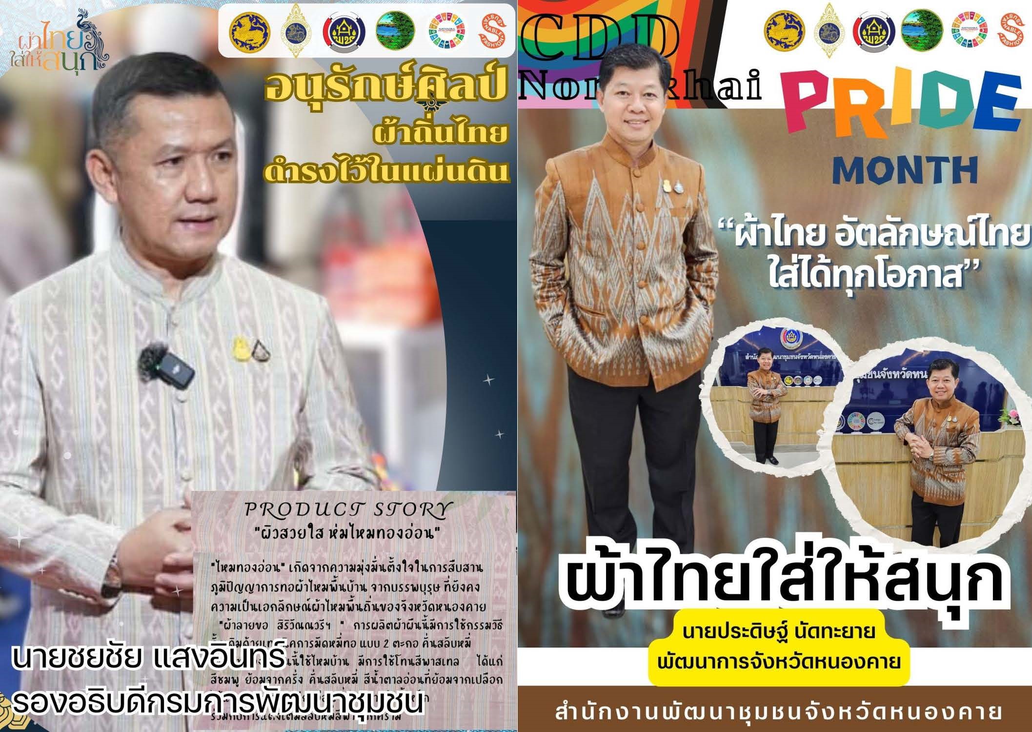 โดย นายประดิษฐ์ นัดทะยาย พัฒนาการจังหวัดหนองคาย พร้อมด้วยผู้อำนวยการกลุ่มงาน พัฒนาการอำเภอ เจ้าหน้าที่พัฒนาชุมชน และเครือข่ายพัฒนา เชิญชวนสวมใส่ผ้าไทย เพื่อร่วมอนุรักษ์ภูมิปัญญาผ้าไทย ผ้าพื้นเมือง ส่งเสริมอาชีพการทอผ้า สร้างงานให้กลุ่มผู้ผลิตชุมชน กระตุ้นและส่งเสริมเศรษฐกิจฐานรากด้วยการสวมใส่ผ้าไทย✨