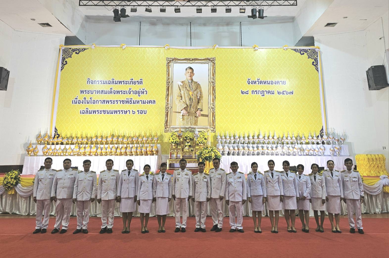 วันที่ 28 กรกฎาคม 2567 เวลา 19.19 น. นายสมภพ สมิตะสิริ ผู้ว่าราชการจังหวัดหนองคาย มอบหมายให้นายรัฐศาสตร์ ชิดชู รองผู้ว่าราชการจังหวัดหนองคาย เป็นประธานในพิธีถวายเครื่องราชสักการะและวางพานพุ่ม และจุดเทียนถวายพระชัยมงคล เฉลิมพระเกียรติพระบาทสมเด็จพระเจ้าอยู่หัว เนื่องในโอกาสมหามงคลเฉลิมพระชนมพรรษา 6 รอบ 28 กรกฎาคม 2567 ณ หอประชุมประจักษ์ศิลปาคม ศาลากลางจังหวัดหนองคาย