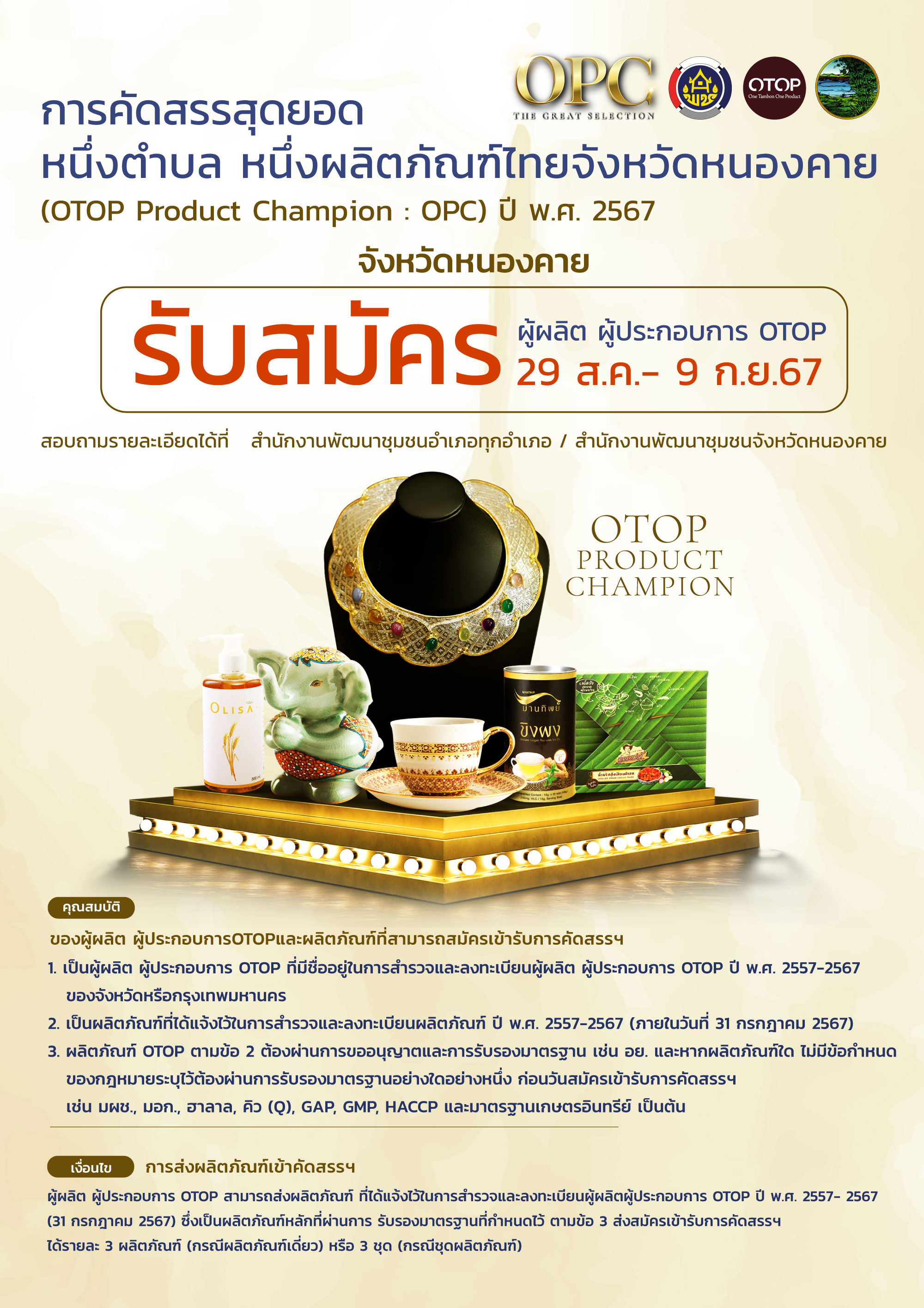 1.เป็นผู้ผลิต ผู้ประกอบการ OTOP ที่มีชื่ออยู่ในการสำรวจและลงทะเบียนฯ ตั้งแต่ ปี พ.ศ. 2557-2567 ของจังหวัดหรือกรุงเทพฯ
