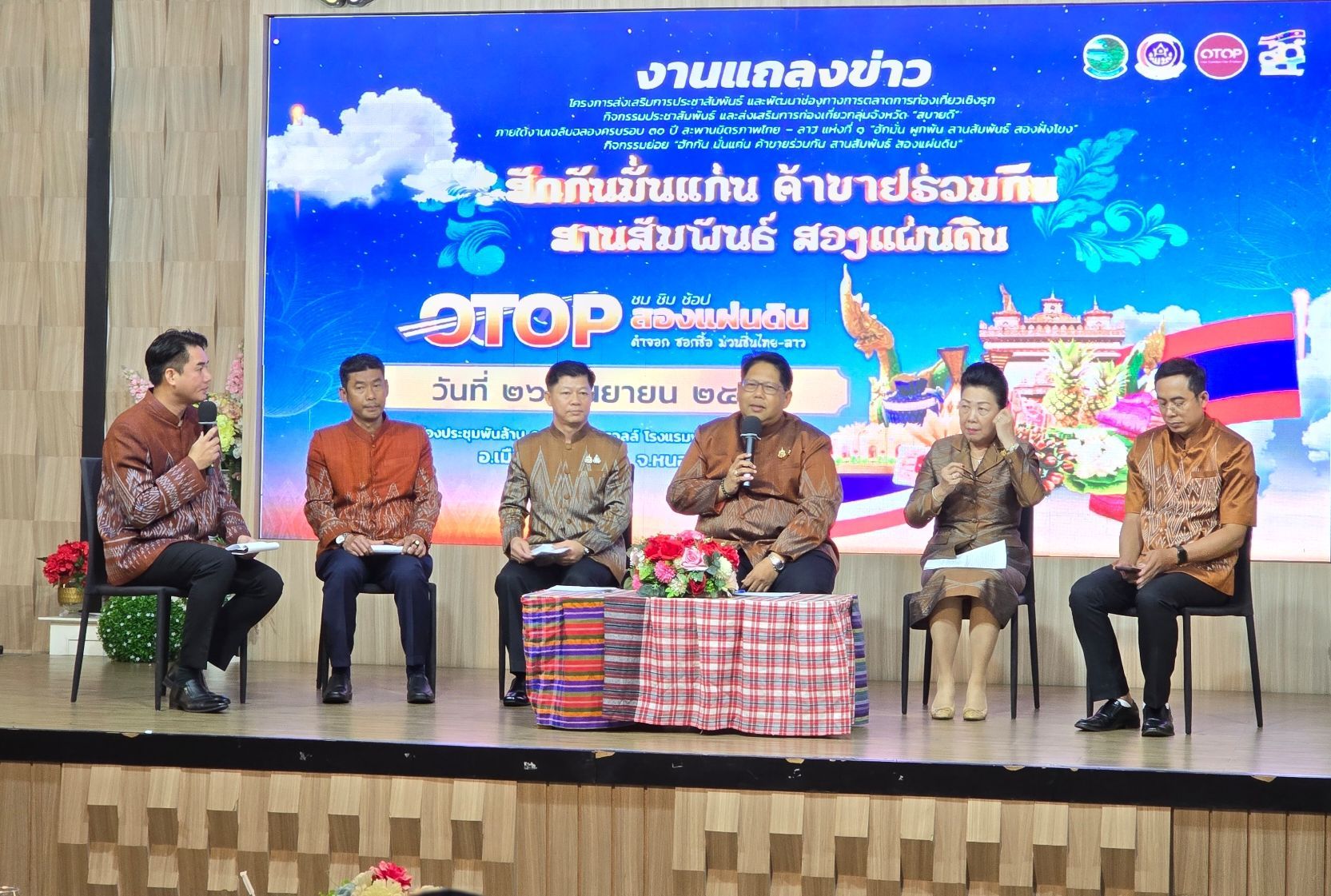 นายสมภพ สมิตะสิริ ผู้ว่าราชการจังหวัดหนองคาย พร้อมด้วย นายประดิษฐ์ นัดทะยาย พัฒนาการจังหวัดหนองคาย นางมนนิภา โกวิทศิริกุล ประธานหอการค้าจังหวัดหนองคาย นายวีระพงษ์ ผาแก้ว นายกสมาคมส่งเสริมการท่องเที่ยวจังหวัดหนองคาย และ นายธงชัย แหวนเพชร ประธานเครือข่าว OTOP จังหวัดหนองคาย ร่วมกันแถลงข่าว “ฮักกัน มั่นแก่น ค้าขายร่วมกัน สานสัมพันธ์ สองแผ่นดิน” ภายใต้โครงการส่งเสริมการประชาสัมพันธ์และพัฒนาช่องทางการตลาดการท่องเที่ยวเชิงรุก กิจกรรมประชาสัมพันธ์และส่งเสริมการท่องเที่ยวกลุ่มจังหวัด “สบายดี”