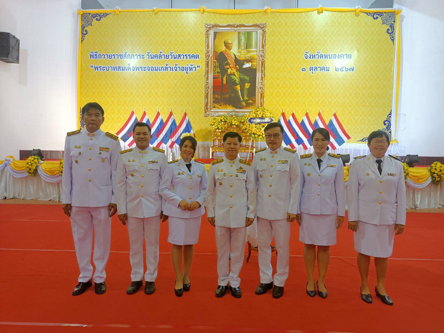 วันที่ 1 ตุลาคม 2567 เวลา 08.30 น. นายสมภพ สมิตะสิระ ผู้ว่าราชการจังหวัดหนองคาย เป็นประธานในพิธีได้วางพวงมาลาถวายราชสักการะ จุดธูปเทียนเครื่องทองน้อย กล่าวคำถวายราชสดุดีน้อมรำลึกในพระมหากรุณาธิคุณ เนื่องใน “วันคล้ายวันสวรรคตพระบาทสมเด็จพระจอมเกล้าเจ้าอยู่หัว” และนำผู้ร่วมพิธีถวายความเคารพ เบื้องหน้าพระบรมสาทิสลักษณ์ พระบาทสมเด็จพระจอมเกล้าเจ้าอยู่หัว ณ หอประชุมประจักษศิลปาคม ศาลากลางจังหวัดหนองคาย โดยมี หัวหน้าส่วนราชการ ข้าราชการ พนักงาน ลูกจ้าง เข้าร่วมพิธีอย่างพร้อมเพรียง