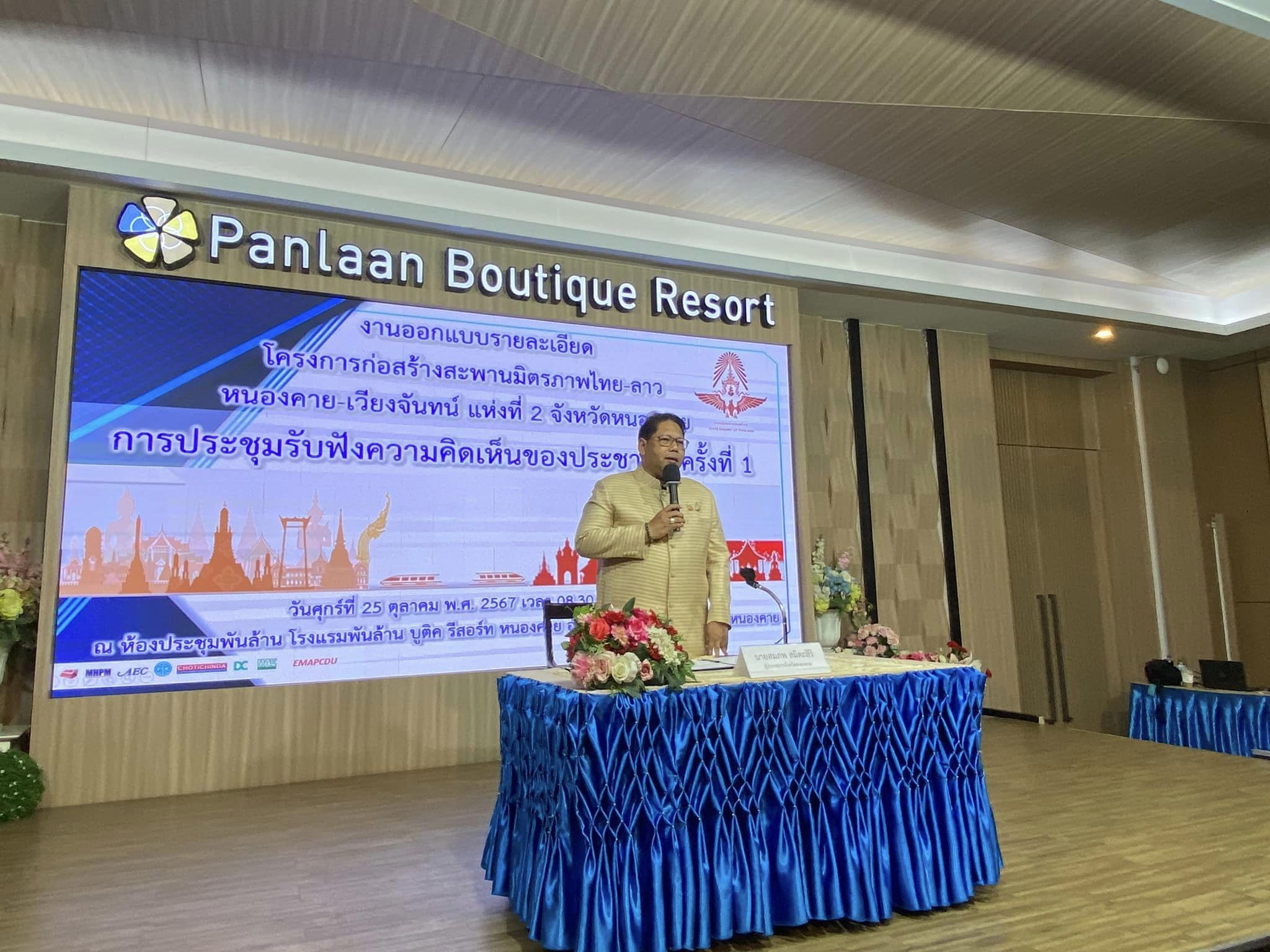 วันที่ 25 ตุลาคม 2567 เวลา 08.30 น. นายสมภพ สมิตะสิริ ผู้ว่าราชการจังหวัดหนองคาย เป็นประธานในพิธีเปิดจัดการประชุมรับฟังความคิดเห็นของประชาชน ครั้งที่ 1 งานออกแบบรายละเอียด โครงการก่อสร้างสะพานมิตรภาพไทย – ลาว หนองคาย – เวียงจันทน์ แห่งที่ 2 จังหวัดหนองคาย ที่การรถไฟแห่งประเทศไทย จัดให้มีขึ้น ณ ห้องประชุมโรงแรมพันล้านบูติค รีสอร์ท หนองคาย อำเภอเมืองหนองคาย จังหวัดหนองคาย