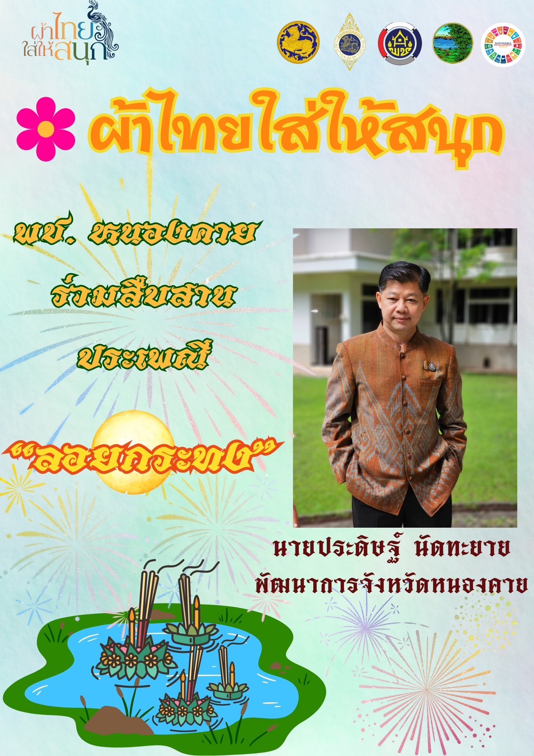 นายประดิษฐ์ นัดทะยาย พัฒนาการจังหวัดหนองคาย ผู้อำนวยการกลุ่มงาน พัฒนาการอำเภอ เจ้าหน้าที่พัฒนาชุมชน และองค์กรภาคีเครือข่ายการพัฒนา เชิญชวนสวมใส่ผ้าไทย ภายใต้แนวคิด “ผ้าไทยใส่ให้สนุก” ในประเพณีลอยกระทง เพื่อร่วมอนุรักษ์ภูมิปัญญาผ้าไทย ผ้าพื้นเมือง ส่งเสริมอาชีพการทอผ้า สร้างงานให้กลุ่มผู้ผลิตชุมชน กระตุ้นและส่งเสริมเศรษฐกิจฐานรากด้วยการสวมใส่ผ้าไทยในโอกาสต่างๆ ประเพณี และเทศกาลสำคัญของไทย✨