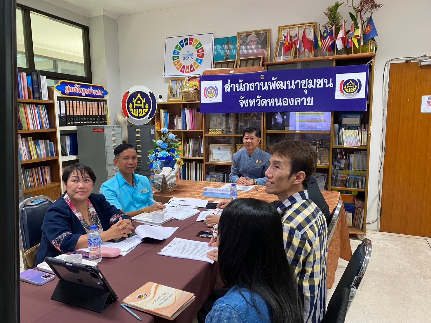 โดยมี นายประดิษฐ์ นัดทะยาย พัฒนาการจังหวัดหนองคาย พร้อมด้วย นายสุรชาติ ตันติปาลี ผู้อำนวยการกลุ่มงานส่งเสริมการพัฒนาชุมชน นางณิชชา มณฑีรรัตน์ พัฒนาการอำเภอเฝ้าไร่ และนายสุภัทร พุฒศรี ผู้ช่วยผู้อำนวยการกลุ่มงานส่งเสริมการพัฒนาชุมชน และนักวิชาการพัฒนาชุมกลุ่มงานส่งเสริมการพัฒนาชุมชน ณ สำนักงานพัฒนาชุมชนจังหวัดหนองคาย ศาลากลางจังหวัดหนองคาย ชั้น 1 เพื่อสร้างความรู้ ความเข้าใจแนวทางการตรวจประเมินศักยภาพศูนย์เรียนรู้การพัฒนาคุณภาพชีวิตตามหลักทฤษฎีใหม่ ประยุกต์สู่ “โคก หนอง นา” ให้เป็นไปด้วยความเรียบร้อย บรรลุตามวัตถุประสงค์