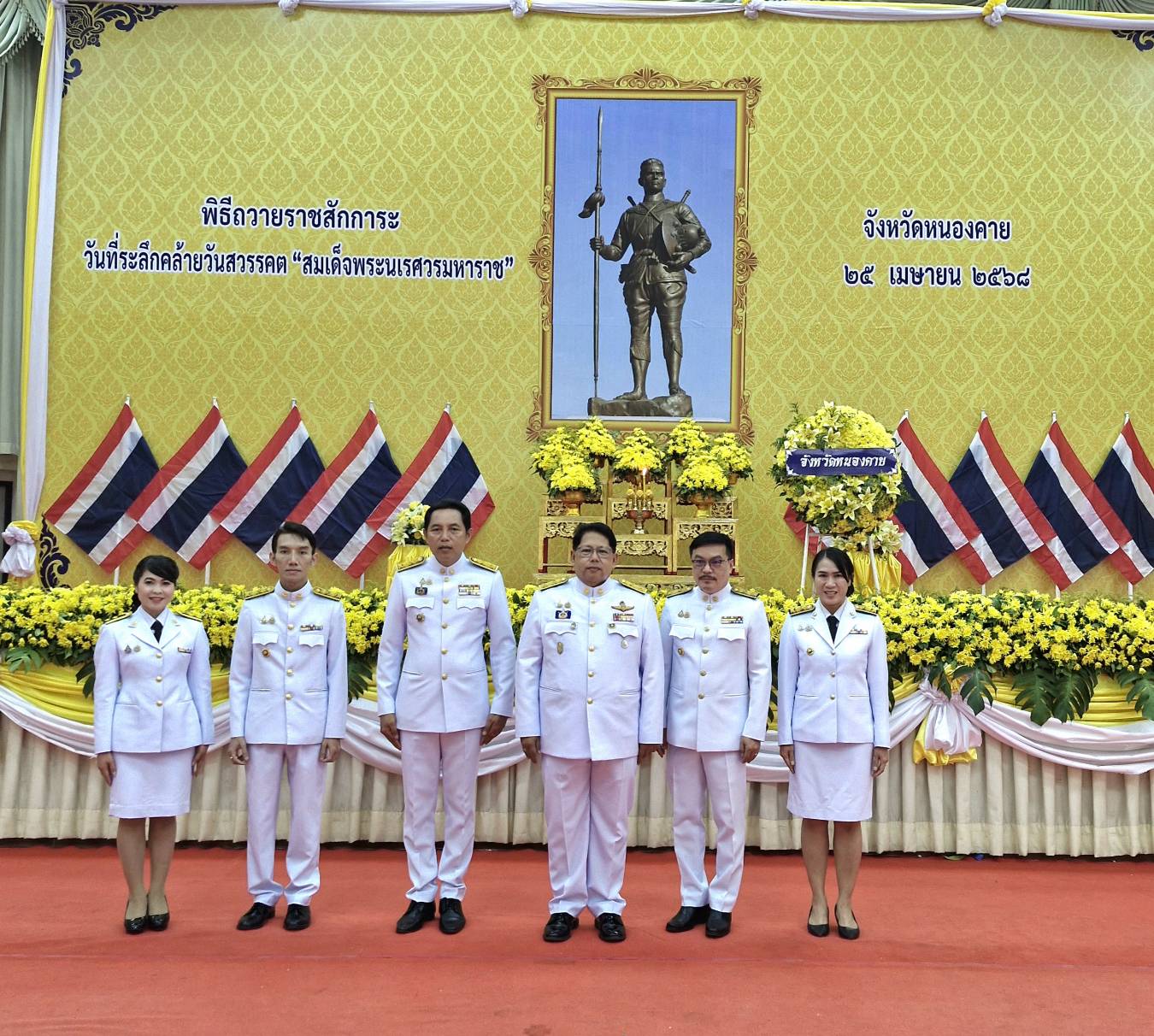 วันที่ 25 เมษายน 2568 เวลา 08.30 น. นายสมภพ สมิตะสิริ ผู้ว่าราชการจังหวัดหนองคาย เป็นประธานในพิธีวางพวงมาลาและถวายราชสดุดีเนื่องในวันคล้ายวันสวรรคต “สมเด็จพระนเรศวรมหาราช” ประจำปีพุทธศักราช 2568 ณ หอประชุมอนันตนาคราช วิทยาลัยอาชีวศึกษาหนองคาย