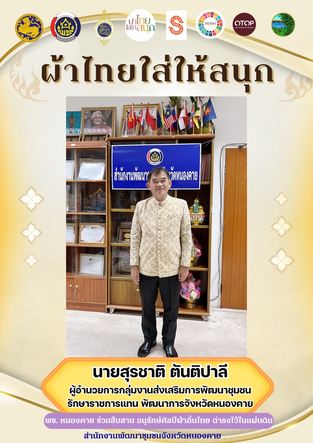 สำนักงานพัฒนาชุมชนจังหวัดหนองคาย และเครือข่ายพัฒนา เชิญชวนสวมใส่ผ้าไทย เพื่อร่วมอนุรักษ์ภูมิปัญญาผ้าไทย ผ้าพื้นเมือง ส่งเสริมอาชีพการทอผ้า สร้างงานให้กลุ่มผู้ผลิตชุมชน กระตุ้นและส่งเสริมเศรษฐกิจฐานรากด้วยการสวมใส่ผ้าไทย✨