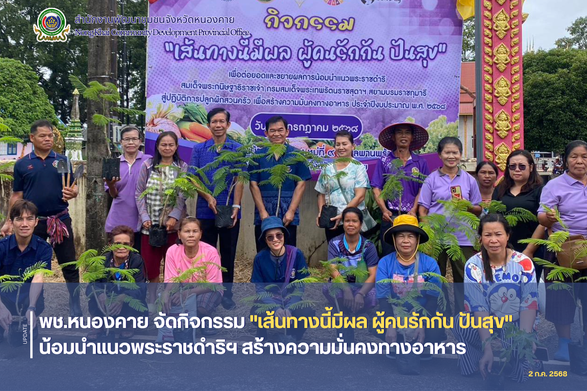 วันที่ 2 กรกฎาคม 2568 เวลา 09.00 น. สำนักงานพัฒนาชุมชนจังหวัดหนองคาย นำโดยนายสุรชาติ ตันติปาลี ผู้อำนวยการกลุ่มงานส่งเสริมการพัฒนาชุมชน รักษาราชการแทน พัฒนาการจังหวัดหนองคาย พร้อมด้วยบุคลากรในสังกัด จัดกิจกรรม “เส้นทางนี้มีผล ผู้คนรักกัน ปันสุข” ภายใต้โครงการส่งเสริมกิจกรรมทางนี้มีผล ผู้คนรักกัน ณ บริเวณบ้านหนองแวง หมู่ที่ 9 ตำบลพานพร้าว อำเภอศรีเชียงใหม่ จังหวัดหนองคาย โดยมีนางสาวสรัญญา ตุลาพันธ์ พัฒนาการอำเภอศรีเชียงใหม่ พร้อมด้วยบุคลากรในสังกัด กำนัน ผู้ใหญ่บ้าน ผู้นำชุมชน และครัวเรือนต้นแบบ รวม 40 คน ร่วมกิจกรรม