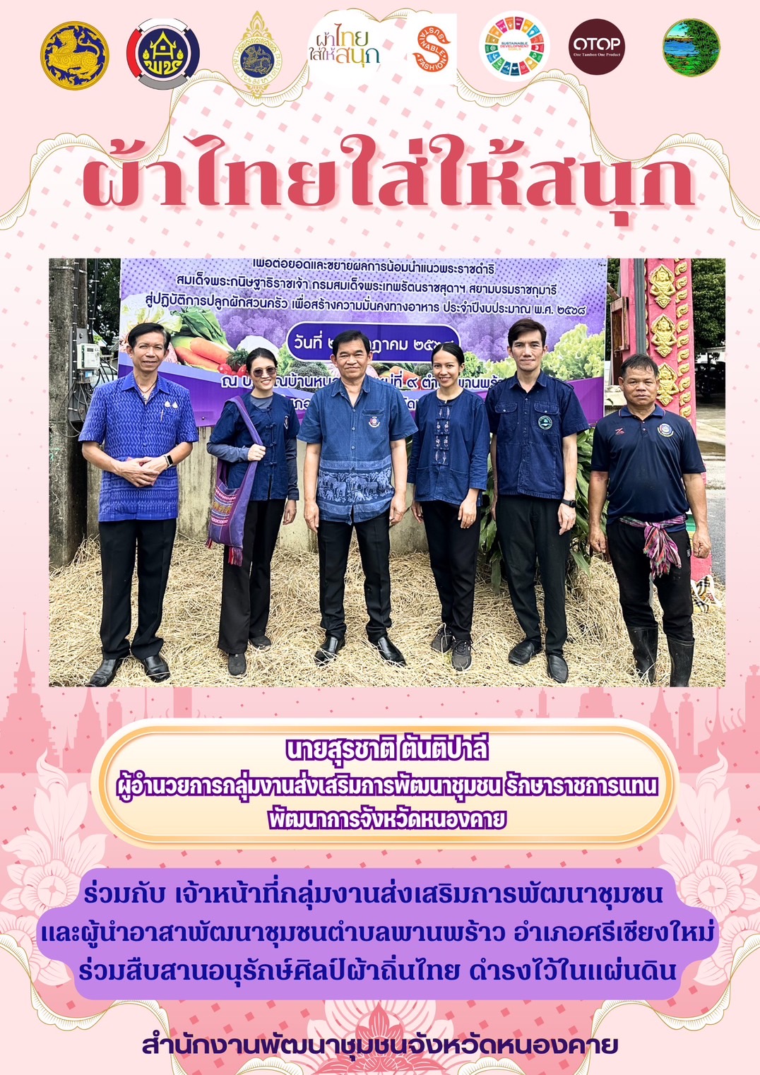 นายจำลักษ์ กันเพ็ชร์ รองผู้ว่าราชการจังหวัดหนองคาย ร่วมกับ สำนักงานพัฒนาชุมชนจังหวัดหนองคาย หัวหน้าส่วนราชการระดับอำเภอ เจ้าหน้าที่พัฒนาชุมชน และภาคีเครือข่ายการพัฒนา เชิญชวนสวมใส่ผ้าไทย เพื่อร่วมอนุรักษ์ภูมิปัญญาผ้าไทย ผ้าพื้นเมือง ส่งเสริมอาชีพการทอผ้า สร้างงานให้กลุ่มผู้ผลิตชุมชน กระตุ้นและส่งเสริมเศรษฐกิจฐานรากด้วยการสวมใส่ผ้าไทย✨