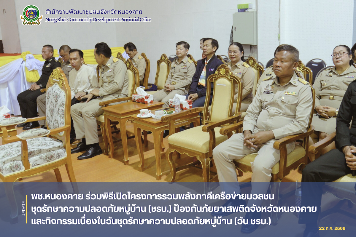 ในการนี้ นายประดิษฐ์ นัดทะยาย พัฒนาการจังหวัดหนองคาย เข้าร่วมพิธีเปิดโครงการดังกล่าว ซึ่งมีวัตถุประสงค์เพื่อเป็นการเชิดชูเกียรติ สร้างขวัญและกำลังใจให้แก่พี่น้อง ชรบ. ที่ปฏิบัติหน้าที่ด้วยความเสียสละ เนื่องในวัน ชรบ. ประจำปี 2568 และเสริมสร้างและพัฒนาศักยภาพของ ชรบ. ให้มีความรู้ ความเข้าใจในสถานการณ์ยาเสพติดและแนวทางการป้องกัน โดยคณะรัฐมนตรีได้มีมติให้วันที่ 16 กรกฎาคมของทุกปี เป็น “วันชุดรักษาความปลอดภัยหมู่บ้าน”หรือ “วัน ชรบ.”