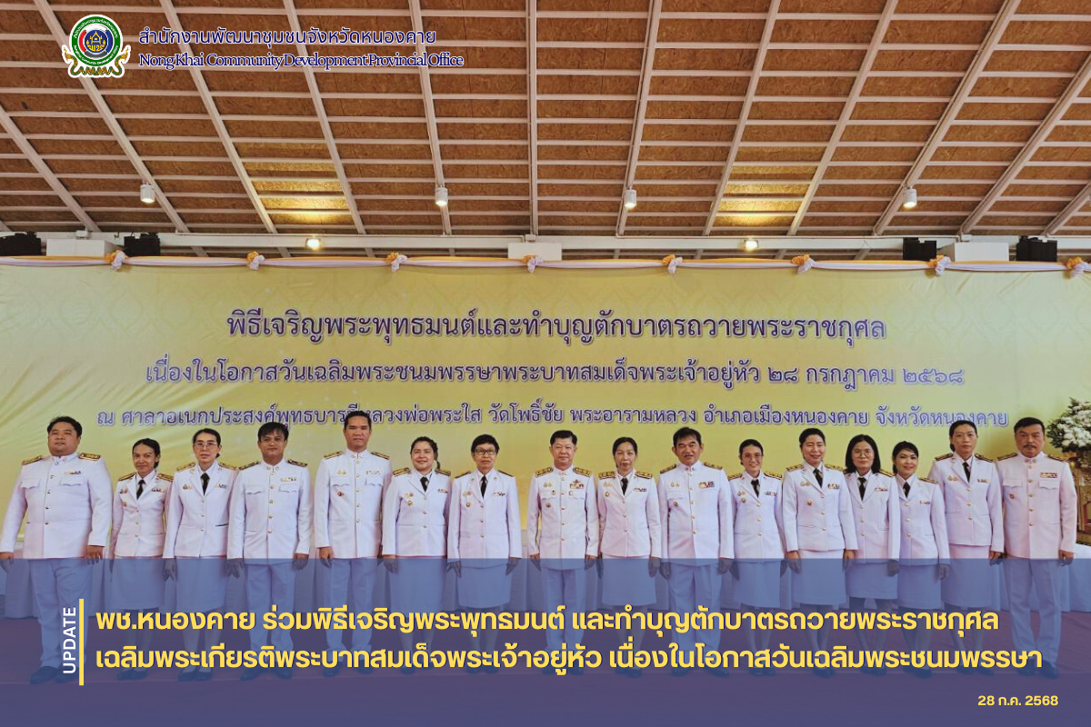 วันที่ 28 กรกฎาคม 2568 เวลา 07.00 น. นายสมภพ สมิตะสิริ ผู้ว่าราชการจังหวัดหนองคาย เป็นประธานฝ่ายฆราวาส และมีพระเทพวชิรคุณ เจ้าคณะจังหวัดหนองคาย/เจ้าอาวาสวัดโพธิ์ชัย พระอารามหลวง เป็นประธานฝ่ายสงฆ์ พิธีเจริญพระพุทธมนต์ และทำบุญตักบาตรถวายพระราชกุศล เฉลิมพระเกียรติพระบาทสมเด็จพระเจ้าอยู่หัว เนื่องในโอกาสวันเฉลิมพระชนมพรรษา 28 กรกฎาคม 2568 โดยมีพระสงฆ์และสามเณร จำนวน 74 รูปออกรับบิณฑบาต ณ วัดโพธิ์ชัย พระอารามหลวง อำเภอเมืองหนองคาย จังหวัดหนองคาย