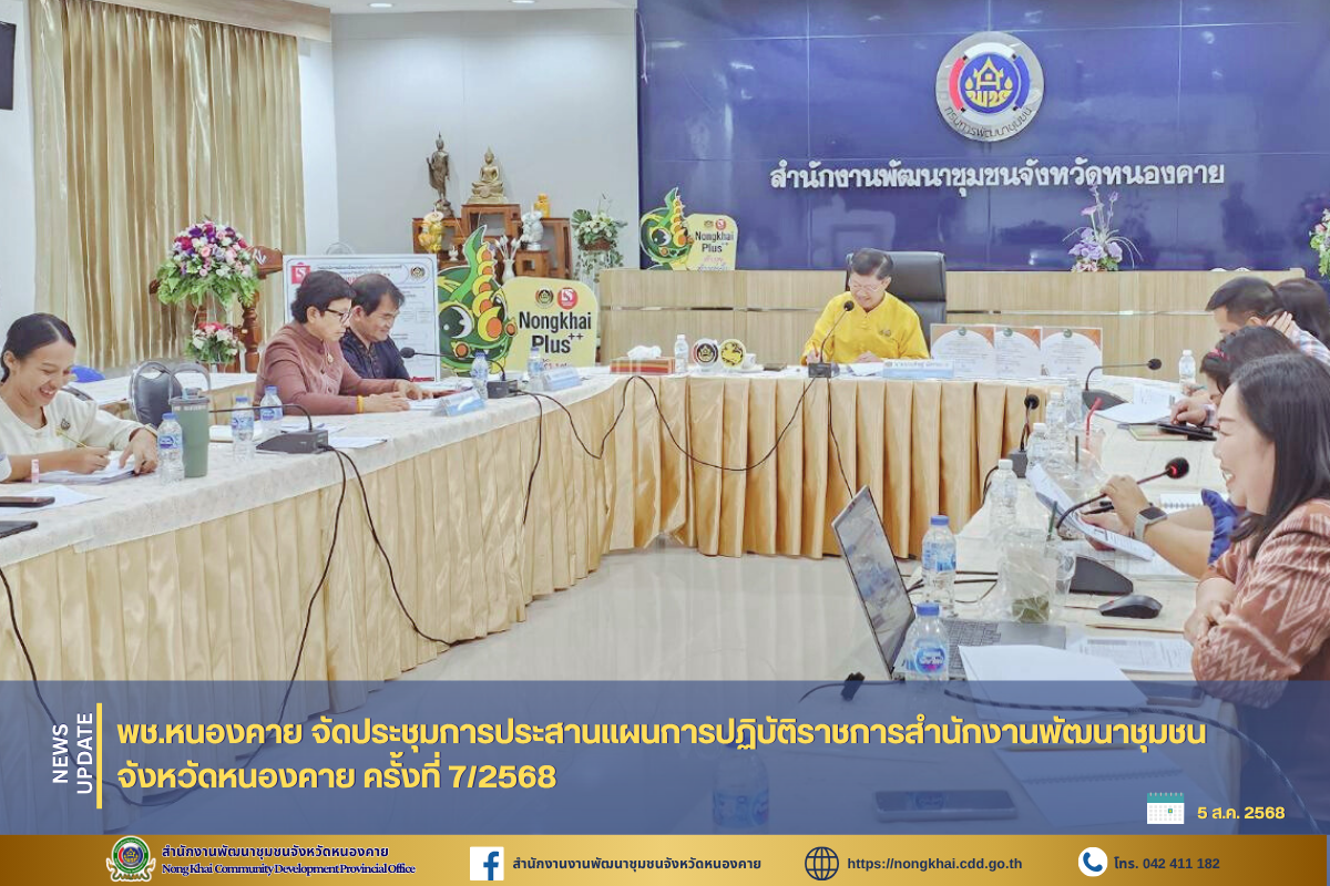 วันที่ 5 สิงหาคม 2568 เวลา 13.30 น. ณ ห้องประชุมสำนักงานพัฒนาชุมชนจังหวัดหนองคาย ชั้น 1 ศาลากลางจังหวัดหนองคาย นายประดิษฐ์ นัดทะยาย พัฒนาการจังหวัดหนองคาย เป็นประธานในการประชุมการประสานแผนการปฏิบัติราชการสำนักงานพัฒนาชุมชนจังหวัดหนองคาย ครั้งที่ 7/2568 โดยมีผู้อำนวยการกลุ่มงาน นักวิชาการพัฒนาชุมชน และเจ้าหน้าที่สำนักงานพัฒนาชุมชนจังหวัดหนองคาย ร่วมประชุมเพื่อติดตามผลการดำเนินงานในรอบเดือนที่ผ่านมา นำเสนอผลการปฏิบัติงานของนักวิชาการพัฒนาชุมชน แต่ละกลุ่มงาน และการประสานแผนการดำเนินโครงการ/กิจกรรม ประจำเดือนสิงหาคม 2568