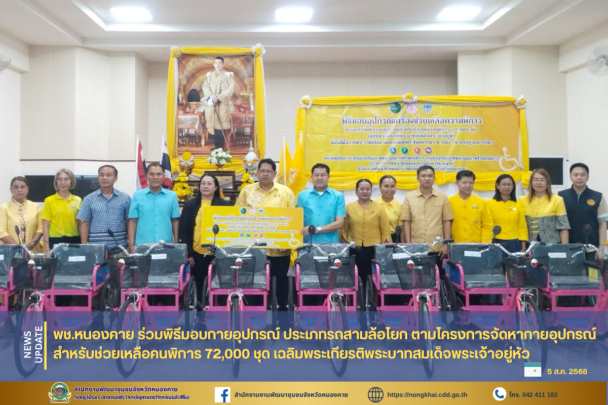วันที่ 5 สิงหาคม 2568 เวลา 15.00 น. นายสมภพ สมิตะสิริ ผู้ว่าราชการจังหวัดหนองคาย เป็นประธานพิธีมอบกายอุปกรณ์ ประเภทรถสามล้อโยก ตามโครงการจัดหากายอุปกรณ์สำหรับช่วยเหลือคนพิการ 72,000 ชุด เฉลิมพระเกียรติพระบาทสมเด็จพระเจ้าอยู่หัว เนื่องในโอกาสพระราชพิธีมหามงคลเฉลิมพระชนมพรรษา 6 รอบ 28 กรกฎาคม 2567 โดยมีนางบุปผา ทัพกฤษณ์ พัฒนาสังคมและความมั่นคงของมนุษย์จังหวัดหนองคาย กล่าวรายงาน มี นางชุติมา ช่างเหล็ก รองประธานแม่บ้านมหาดไทยจังหวัดหนองคาย , หัวหน้าส่วนราชการ , องค์กรปกครองส่วนท้องถิ่น และหน่วยงานที่เกี่ยวข้องเข้าร่วมในพิธีฯ ณ ศูนย์พัฒนาศักยภาพและอาชีพคนพิการจังหวัดหนองคาย อำเภอเมืองหนองคาย จังหวัดหนองคาย