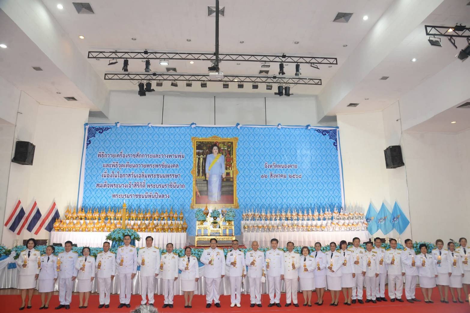 วันที่ 12 สิงหาคม 2568 เวลา 19.19 น. นายสมภพ สมิตะสิริ ผู้ว่าราชการจังหวัดหนองคาย เป็นประธานในพิธีถวายเครื่องราชสักการะและวางพานพุ่ม และจุดเทียนถวายพระพรชัยมงคล สมเด็จพระนางเจ้าสิริกิตติ์ พระบรมราชินีนาถ พระบรมราชชนนีพันปีหลวง เนื่องในโอกาสวันเฉลิมพระชนมพรรษา 12 สิงหาคม 2568 ณ หอประชุมประจักษศิลปาคม ศาลากลางจังหวัดหนองคาย